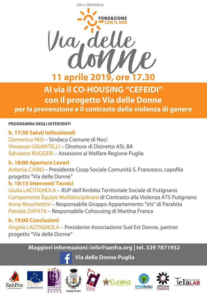 ll co-housing di Noci rientra nel più ampio programma di interventi che il progetto “Via delle donne” ha messo in campo per prevenire e contrastare la violenza di genere, promuovendo percorsi di sensibilizzazione e contribuendo attivamente alla tutela e all’autonomia delle donne e dei loro figli attraverso azioni di inclusione socio-lavorativa e di rafforzamento della rete regionale di accoglienza abitativa collegata ai Centri Antiviolenza. Per le donne sole o con minori prive di validi riferimenti familiari o per le quali si reputi opportuno l’allontanamento dal nucleo familiare, e il sostegno nel percorso d’inserimento o reinserimento sociale, uno dei primi ostacoli può essere rappresentato dalla ricerca di una soluzione abitativa. Il cohousing può rappresentare, a tal fine, la risposta ad un bisogno oggettivo e pratico e, al contempo, può offrire risorse significative per l’avvio di un percorso più ampio di autonomia e re-inserimento sociale.