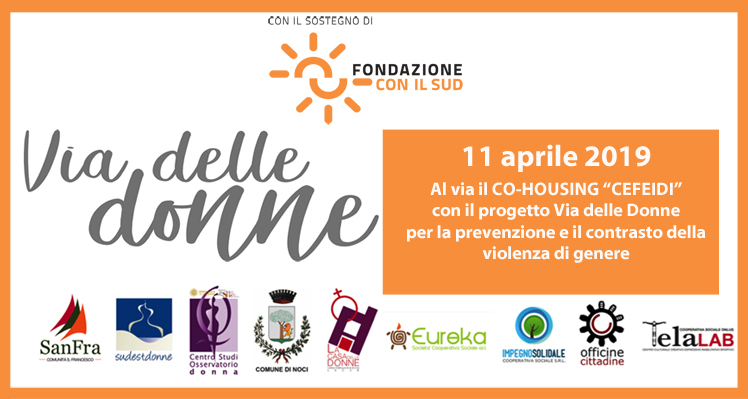 Si terrà domani, giovedì 11 aprile, a partire dalle ore 17.30, in Vico Silvio Pellico a Noci, la conferenza stampa di presentazione dell’azione di co-housing realizzata nell’ambito del progetto regionale “Via delle Donne” sostenuto da Fondazione con il Sud e gestito dal partenariato costituito dalla coop. sociale Comunità S. Francesco in rete con l’associazione Sud Est Donne, l’Università del Salento – Dipartimento di Scienze sociali, il Comune di Noci, le coop. sociali Impegno Solidale, TelaLab ed Eureka e le associazioni Officine Cittadine e Casa delle Donne.