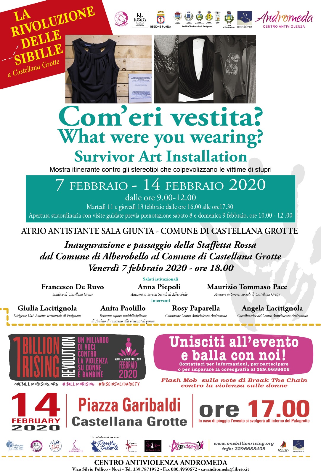 La tappa nella città delle grotte prevede due appuntamenti: la mostra/installazione “Com’eri vestita?”, che verrà inaugurata venerdì 7 febbraio, alle h. 18.00, presso l’Atrio Antistante la Sala Giunta del Comune di Castellana Grotte, e il ballo in piazza Garibaldi con la coreografia del  “One Billion Rising” che si svolge ogni anno in tutto il mondo il 14 febbraio.