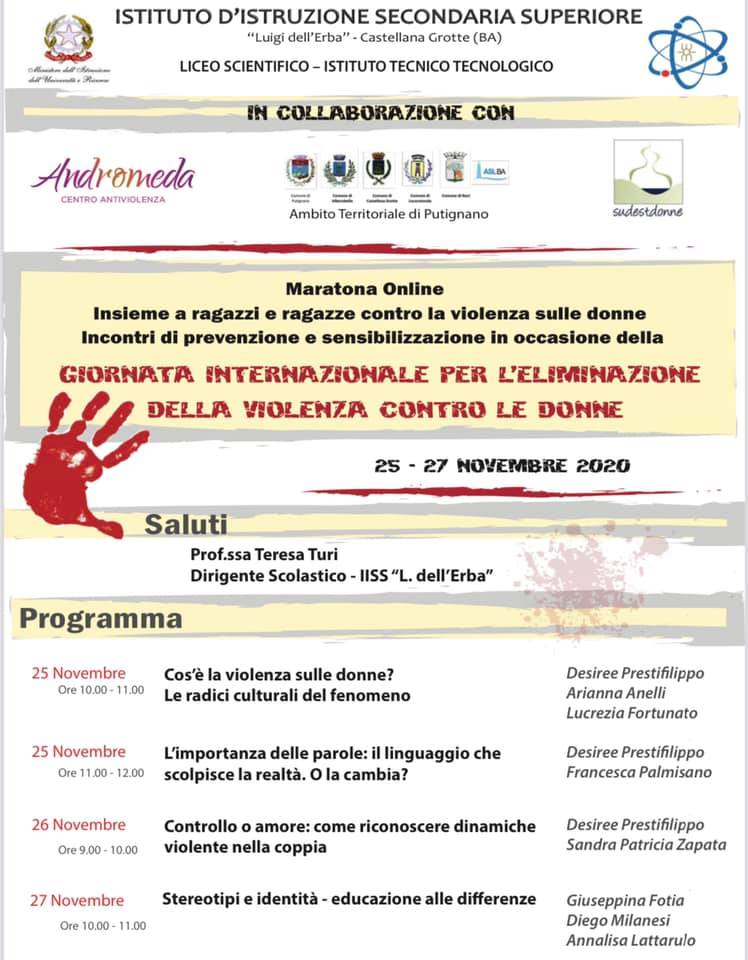 Oggi, invece, sarà interamente dedicato all’universo delle e degli adolescenti, attraverso una lunga maratona online che coinvolgerà la maggior parte degli Istituti superiori dell’Ambito di Putignano: un’iniziativa che travalica i confine provinciali e che vede coinvolti tutti i territori in cui opera la rete dei Cav di Sud Est Donne, attraverso 6 Ambiti territoriali (Gioia del Colle, Grumo Appula, Martina Franca, Ginosa, Massafra), oltre 40 classi delle scuole superiori,16 figure professionali e più di 800 studenti partecipanti.