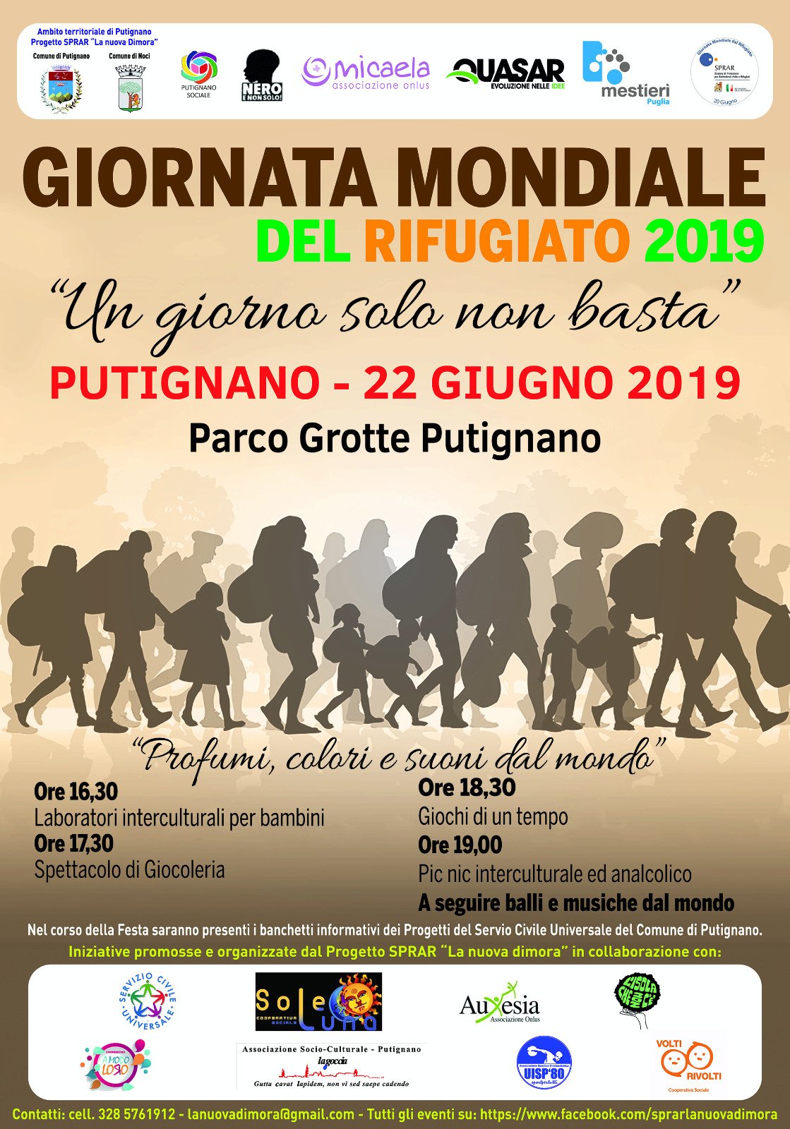 Sabato 22 Giugno il Parco Grotte di Putignano ospiterà, in occasione della Giornata Mondiale del Rifugiato 2019, l’iniziativa “Profumi, Colori e suoni dal Mondo” organizzata nell’ambito del Progetto SPRAR-La Nuova Dimora.