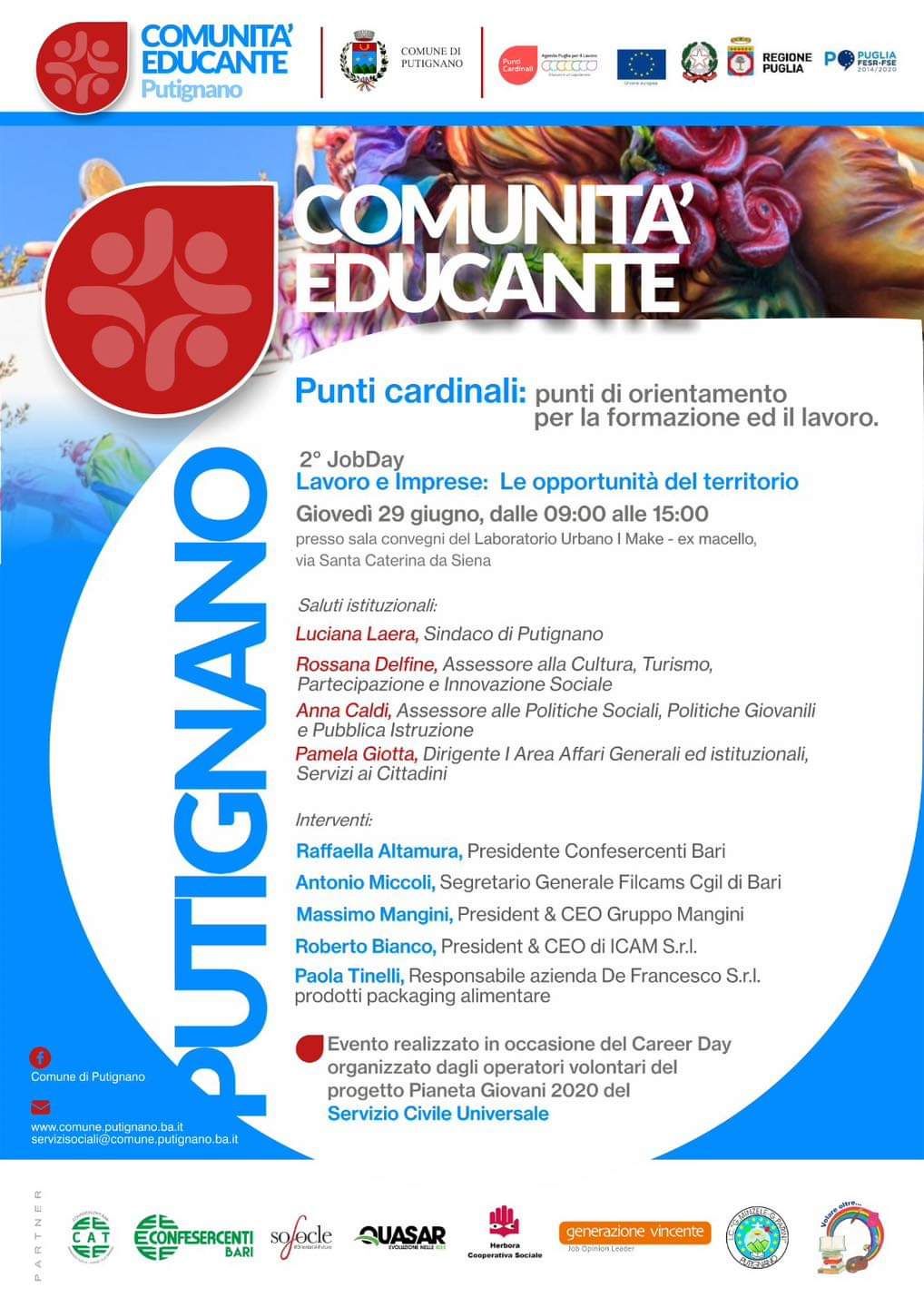 Si comincia mercoledì 28 giugno con il primo Job Day del progetto. L’incontro, in programma dalle ore 9:00 alle 15:00 nella sala Consiliare del Comune di Putignano (via Roma, 8) verterà sul tema “Putignano comunità orientativa educante”. Alle ore 11:00 in programma una conferenza stampa, alla quale parteciperanno i partners del progetto, per presentare i contenuti e lo sviluppo del progetto stesso.